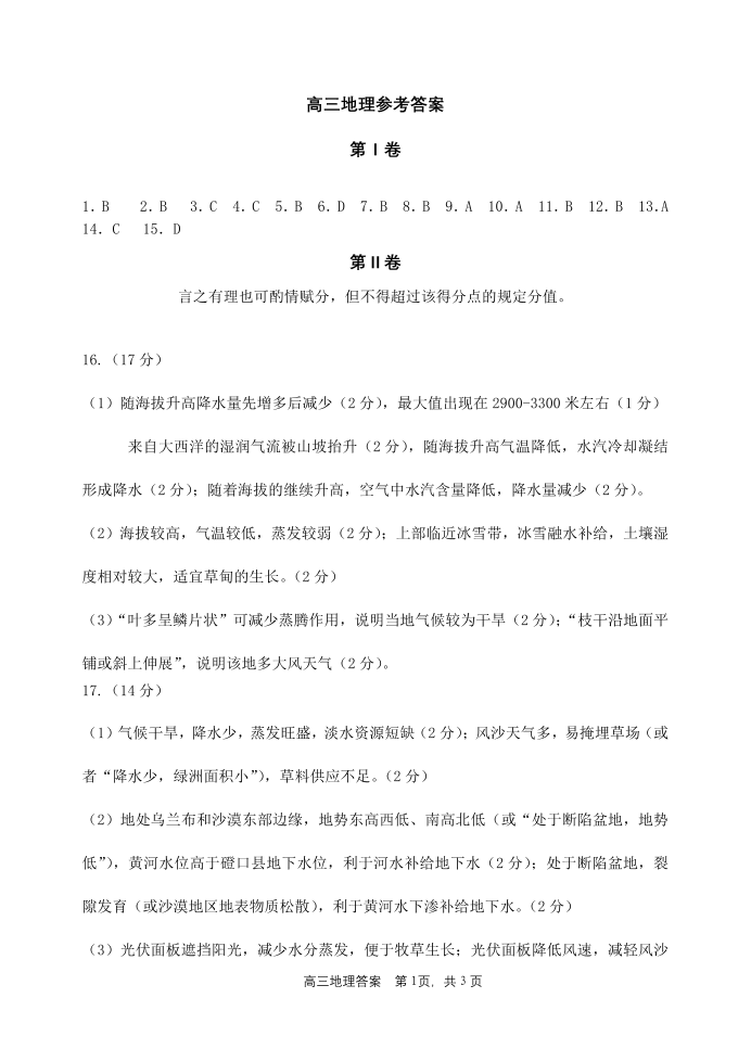 山东省威海市2024-2025学年第一学期1月高三期末学业水平诊断地理答案