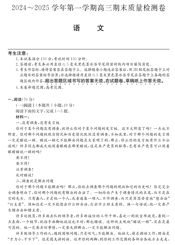 山西省卓越联盟2024-2025学年上学期1月高三期末质量检测语文