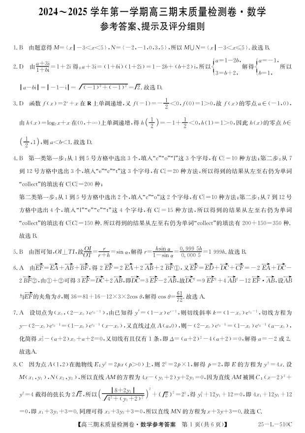 山西省卓越联盟2024-2025学年上学期1月高三期末质量检测数学答案