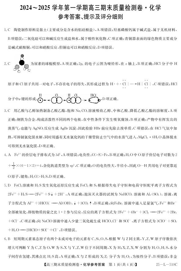 山西省卓越联盟2024-2025学年上学期1月高三期末质量检测化学答案