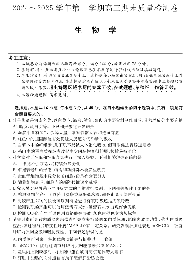 山西省卓越联盟2024-2025学年上学期1月高三期末质量检测生物