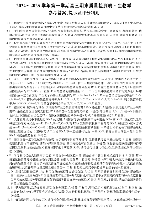山西省卓越联盟2024-2025学年上学期1月高三期末质量检测生物答案