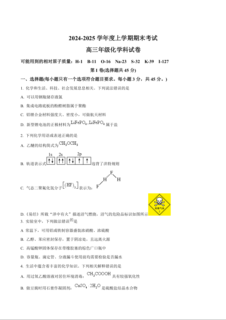 辽宁省五强高中2024-2025学年上学期1月高三期末考试化学+答案