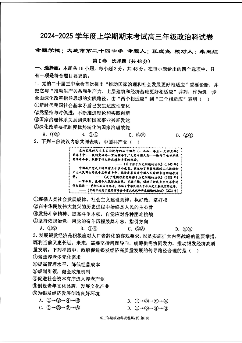 辽宁省五强高中2024-2025学年上学期1月高三期末考试政治+答案