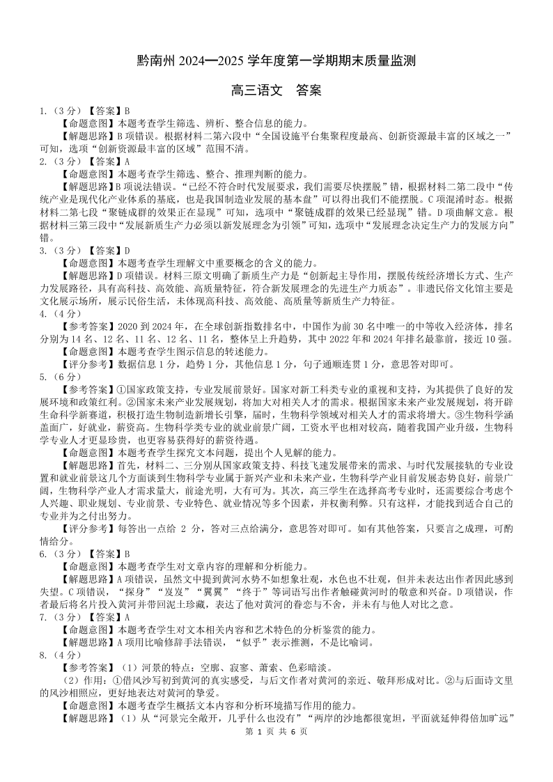 贵州省黔南州2024-2025学年上学期1月高三期末考试语文答案