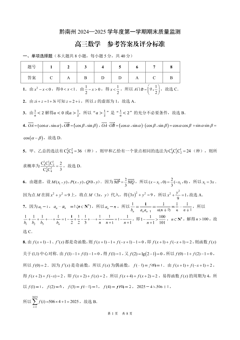 贵州省黔南州2024-2025学年上学期1月高三期末考试数学答案