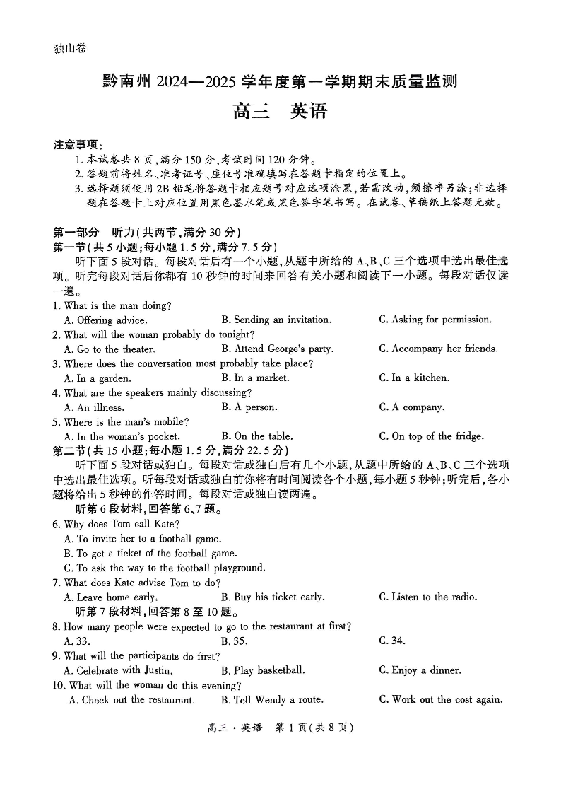 贵州省黔南州2024-2025学年上学期1月高三期末考试英语