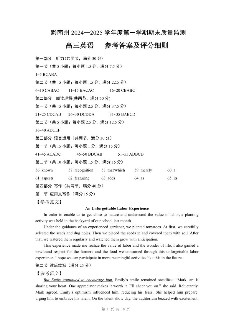 贵州省黔南州2024-2025学年上学期1月高三期末考试英语答案
