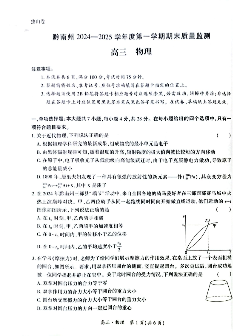 贵州省黔南州2024-2025学年上学期1月高三期末考试物理