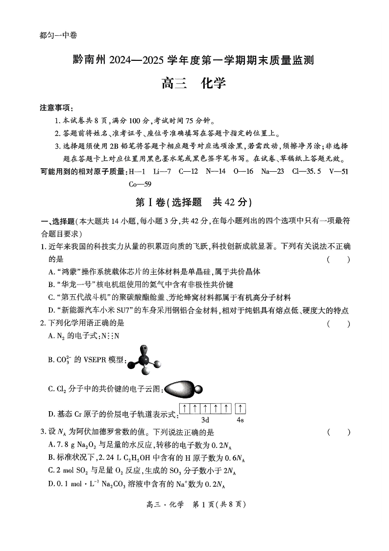 贵州省黔南州2024-2025学年上学期1月高三期末考试化学