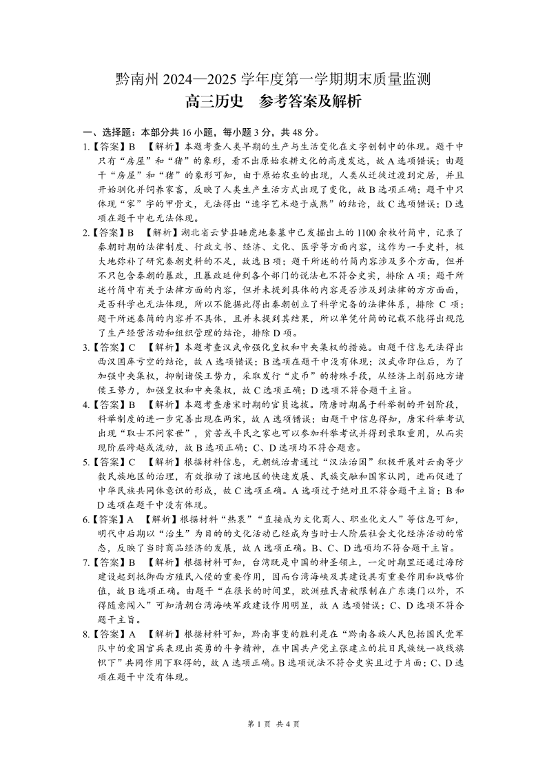贵州省黔南州2024-2025学年上学期1月高三期末考试历史答案