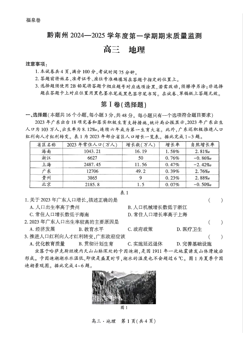 贵州省黔南州2024-2025学年上学期1月高三期末考试地理