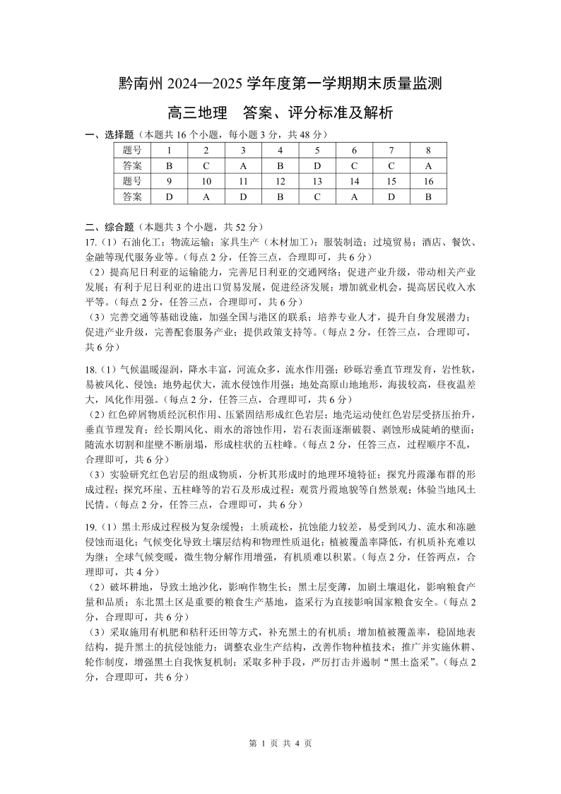 贵州省黔南州2024-2025学年上学期1月高三期末考试地理答案