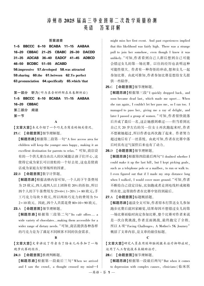 福建省漳州市2024-2025学年上学期1月高三期末考试英语答案