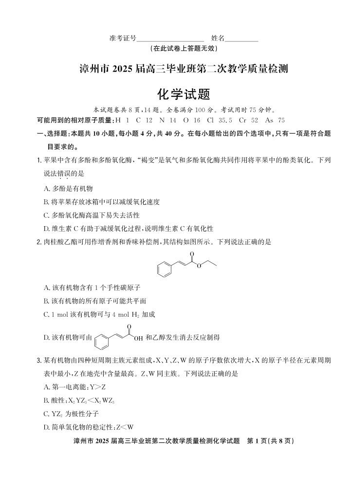 福建省漳州市2024-2025学年上学期1月高三期末考试化学
