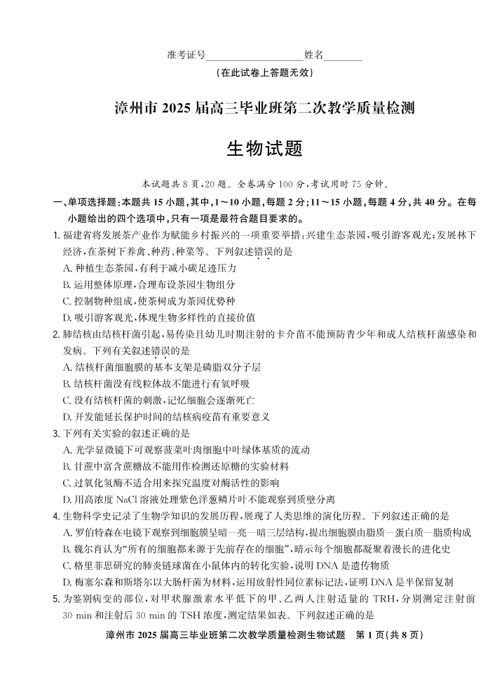 福建省漳州市2024-2025学年上学期1月高三期末考试生物