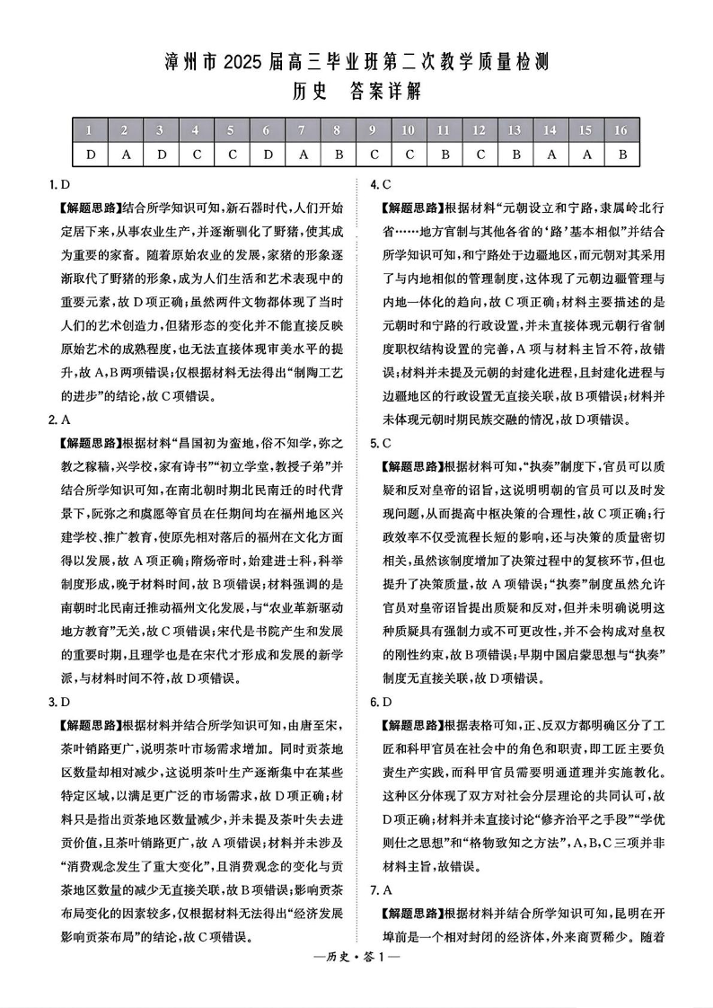 福建省漳州市2024-2025学年上学期1月高三期末考试历史答案