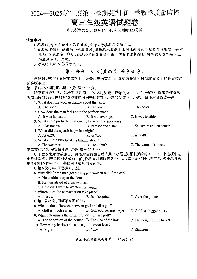 安徽省芜湖市2024-2025学年上学期1月高三期末考试英语