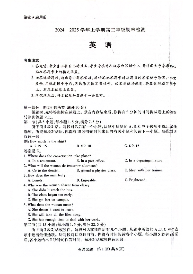 安徽省区域高中2024-2025学年上学期1月高三期末检测英语
