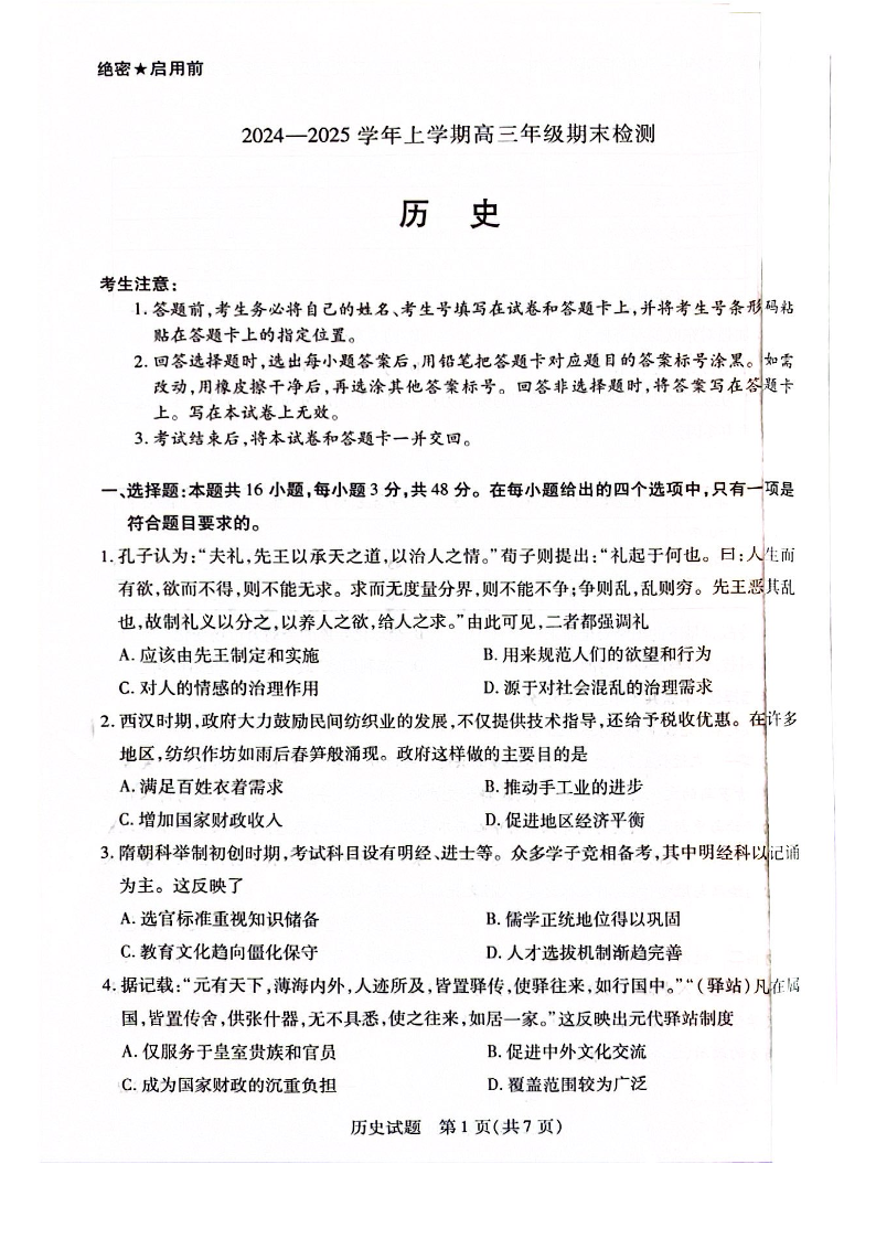 安徽省区域高中2024-2025学年上学期1月高三期末检测历史
