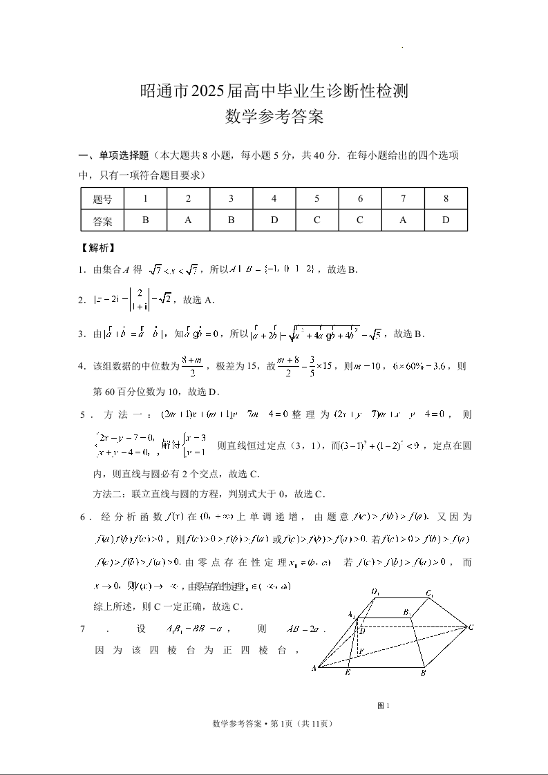 云南省昭通市2025届高三上学期1月诊断性检测数学答案