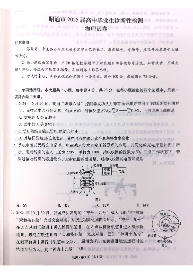 云南省昭通市2025届高三上学期1月诊断性检测物理
