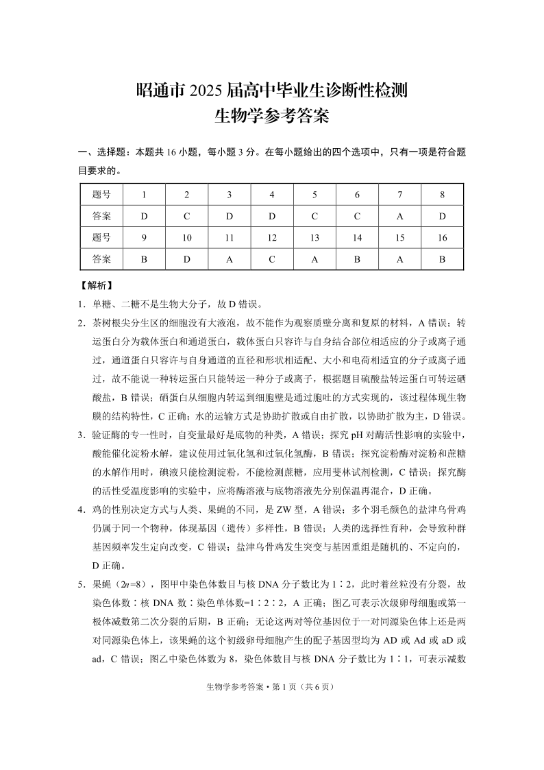 云南省昭通市2025届高三上学期1月诊断性检测生物答案