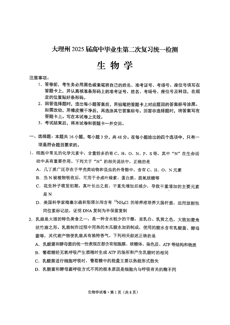 云南省大理州2025届高三上学期第二次复习统一检测生物