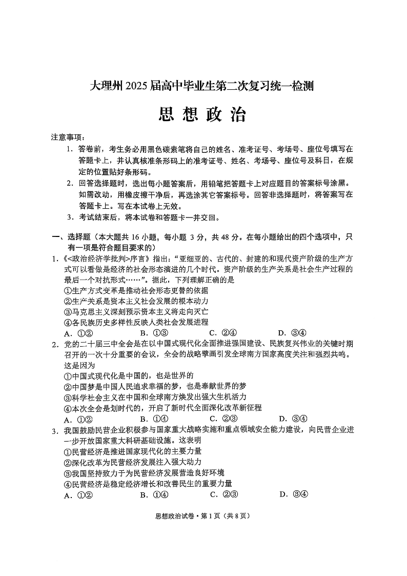 云南省大理州2025届高三上学期第二次复习统一检测政治