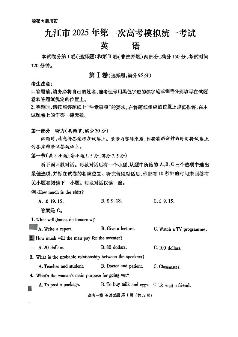 江西省九江市2025届高三上学期第一次高考模拟统一考试英语+答案