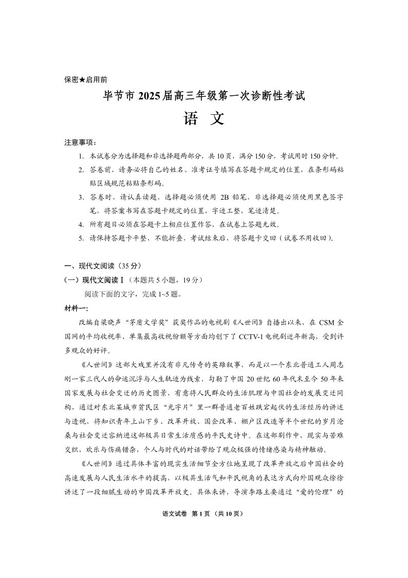贵州省毕节市2025届高三上学期第一次诊断考试语文