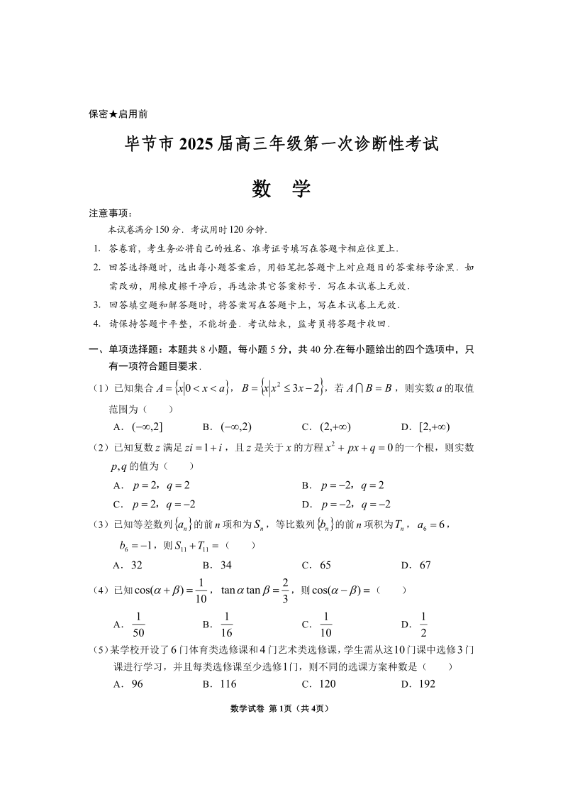 贵州省毕节市2025届高三上学期第一次诊断考试数学