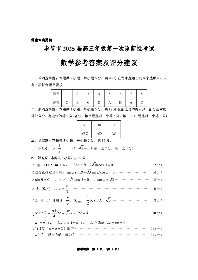 贵州省毕节市2025届高三上学期第一次诊断考试数学答案