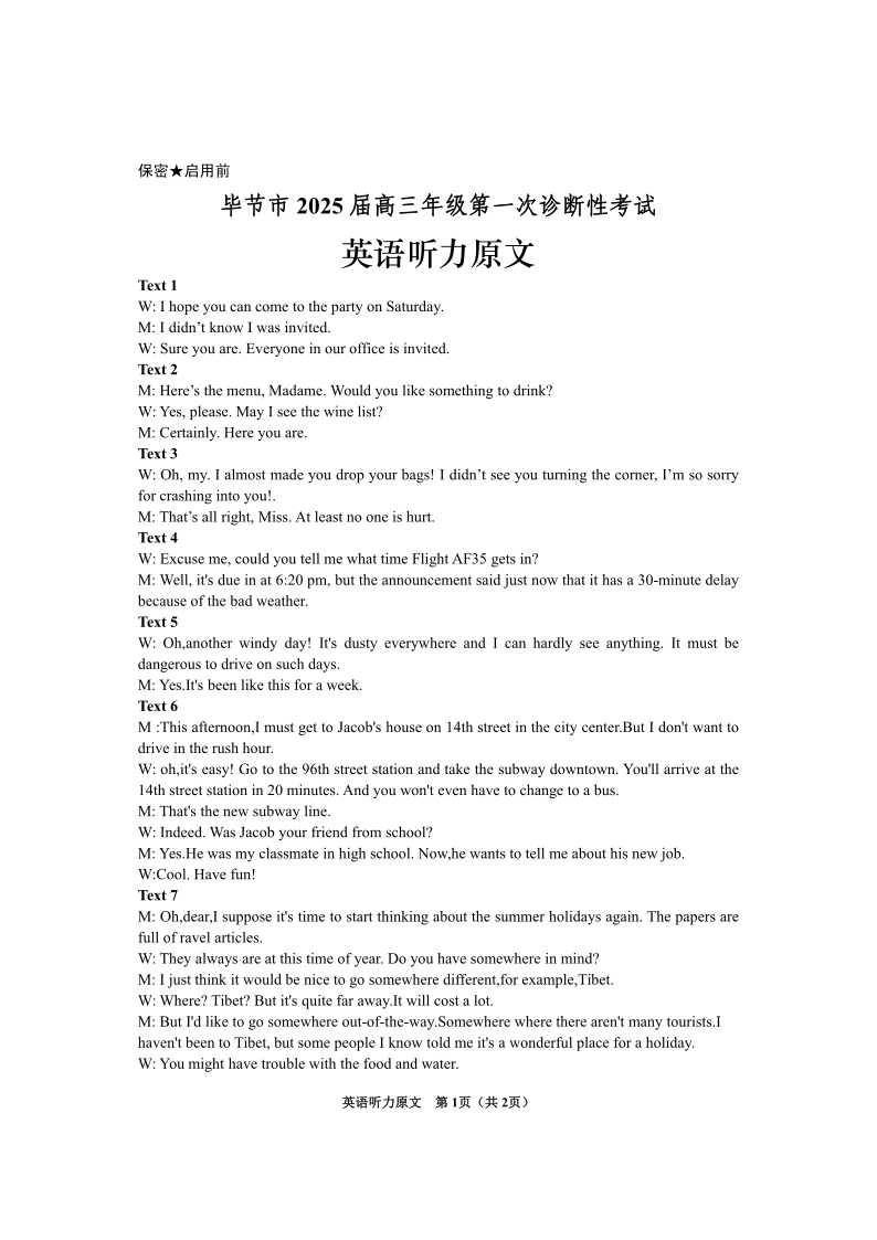 贵州省毕节市2025届高三上学期第一次诊断考试英语听力原文