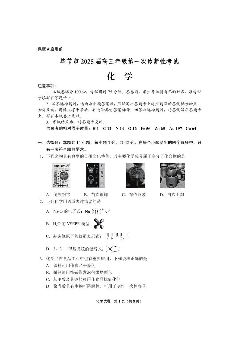 贵州省毕节市2025届高三上学期第一次诊断考试化学