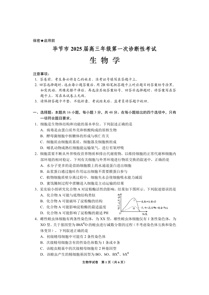 贵州省毕节市2025届高三上学期第一次诊断考试生物