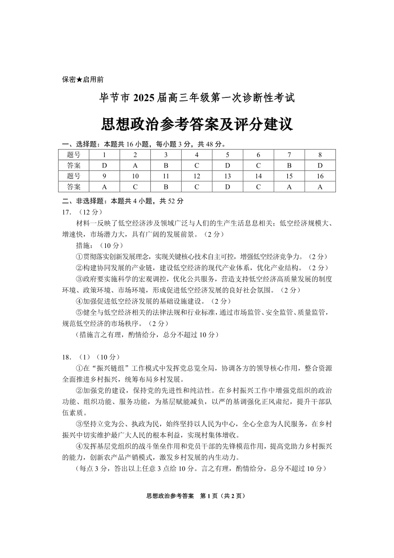 贵州省毕节市2025届高三上学期第一次诊断考试政治答案