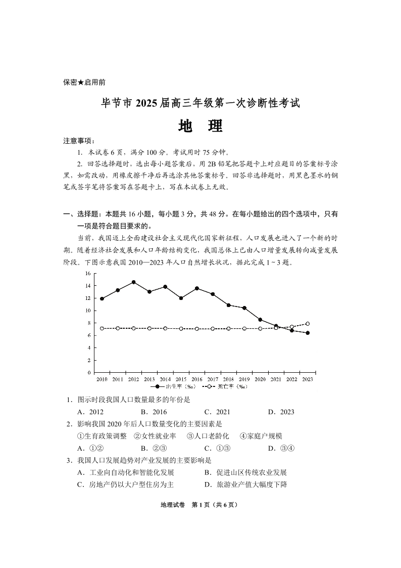 贵州省毕节市2025届高三上学期第一次诊断考试地理