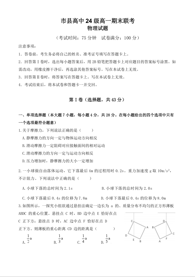 四川省眉山市2024-2025学年上学期1月高一期末联考物理