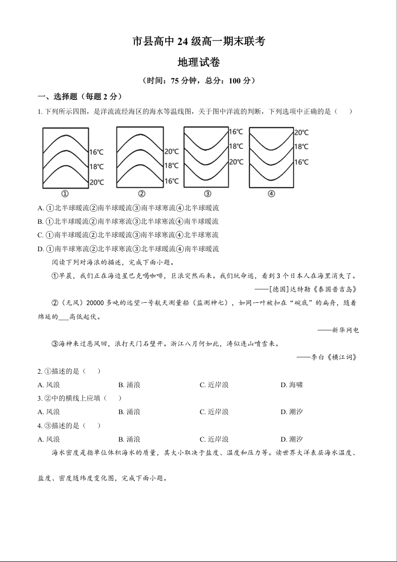 四川省眉山市2024-2025学年上学期1月高一期末联考地理(原卷版)
