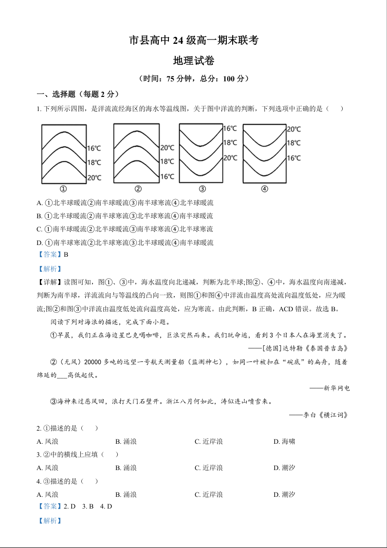 四川省眉山市2024-2025学年上学期1月高一期末联考地理(解析版)