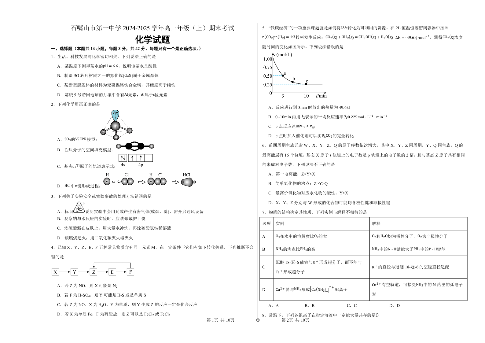 宁夏石嘴山市第一中学2025届上学期1月高三期末考试化学