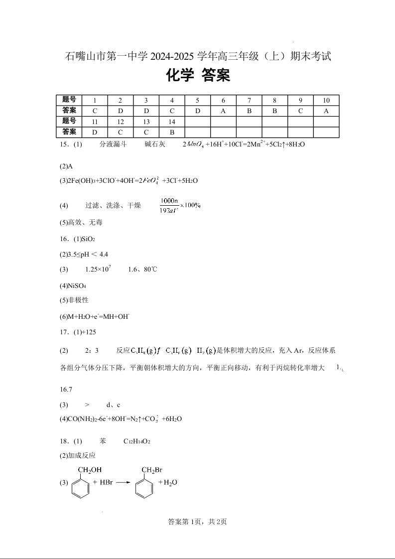 宁夏石嘴山市第一中学2025届上学期1月高三期末考试化学答案