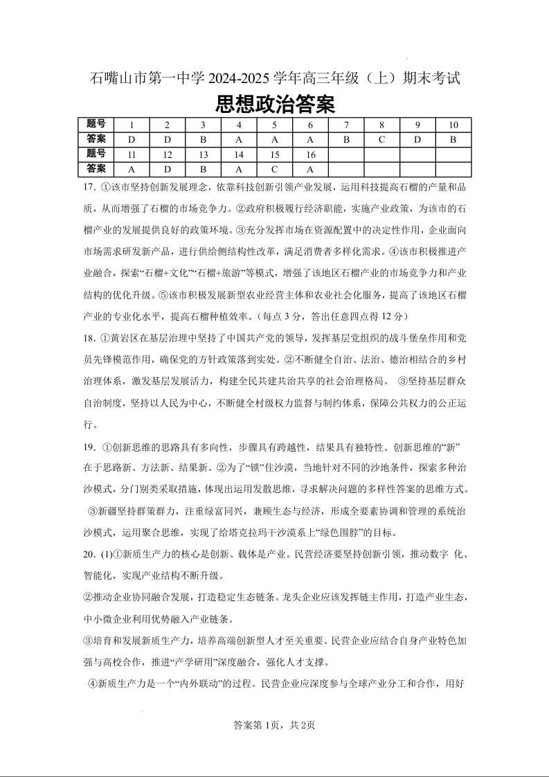 宁夏石嘴山市第一中学2025届上学期1月高三期末考试政治答案