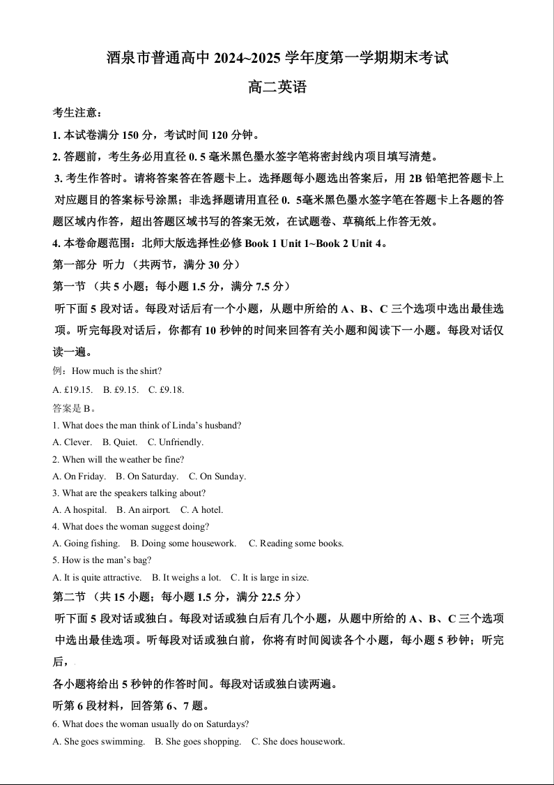 甘肃省酒泉市2024-2025学年上学期1月高二期末考试英语(解析版)