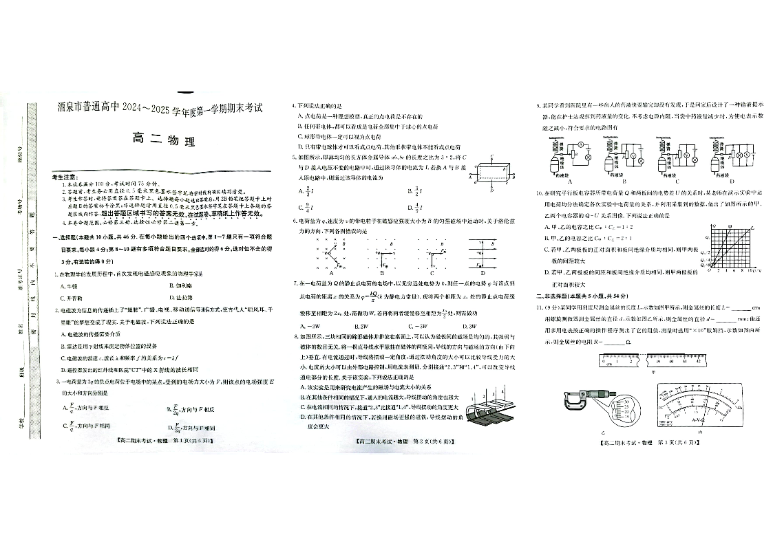 甘肃省酒泉市2024-2025学年上学期1月高二期末考试物理