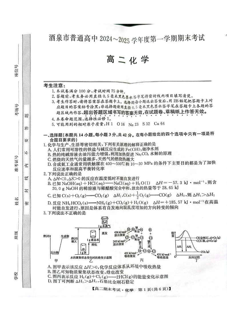甘肃省酒泉市2024-2025学年上学期1月高二期末考试化学