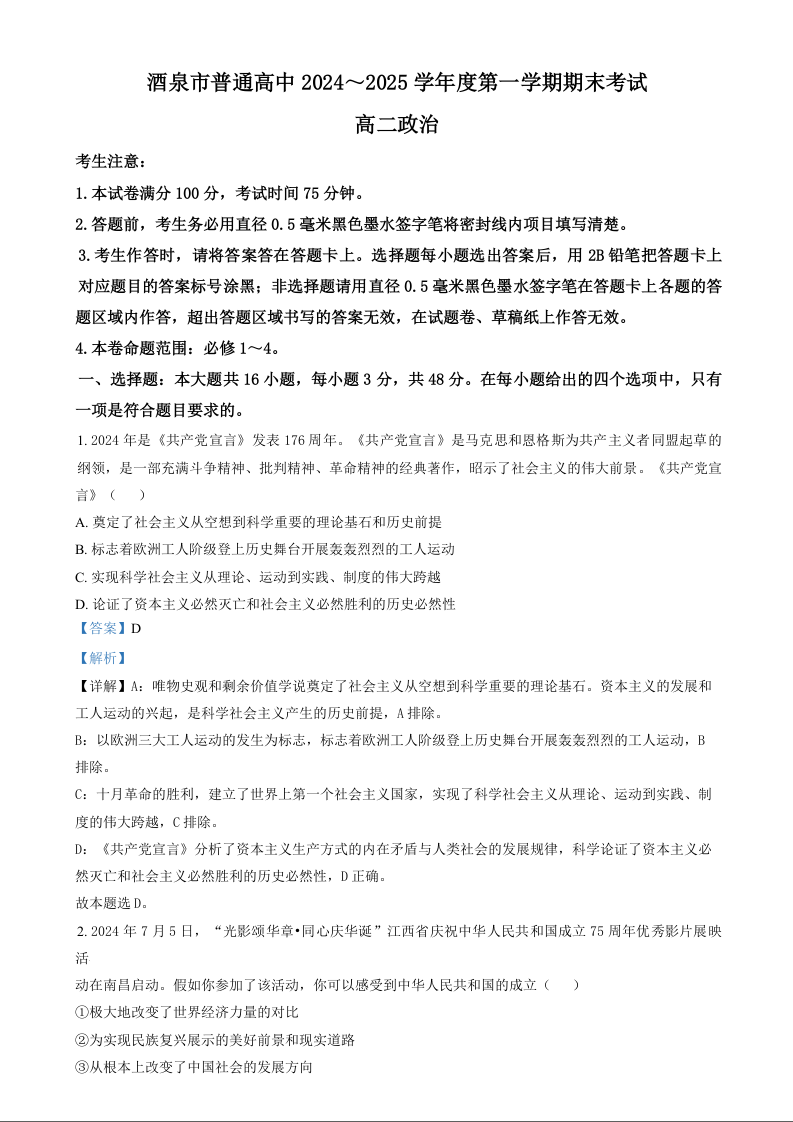 甘肃省酒泉市2024-2025学年上学期1月高二期末考试政治(解析版)