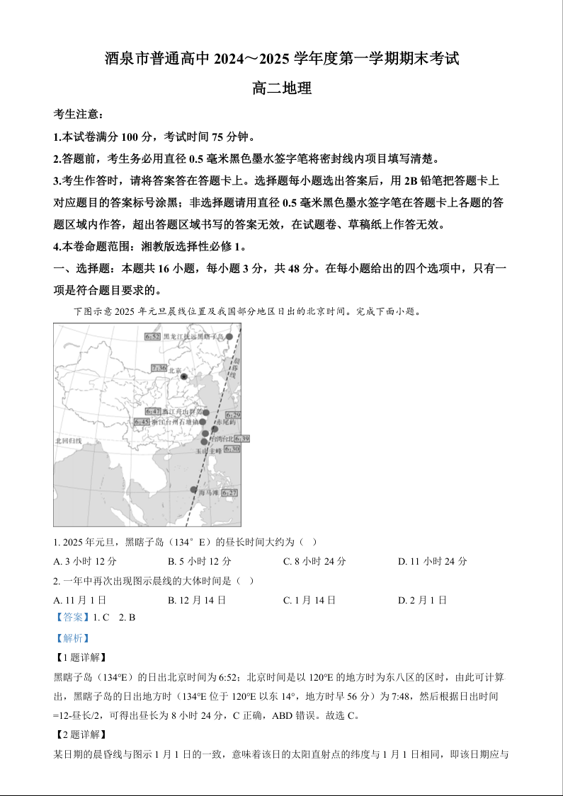 甘肃省酒泉市2024-2025学年上学期1月高二期末考试地理(解析版)