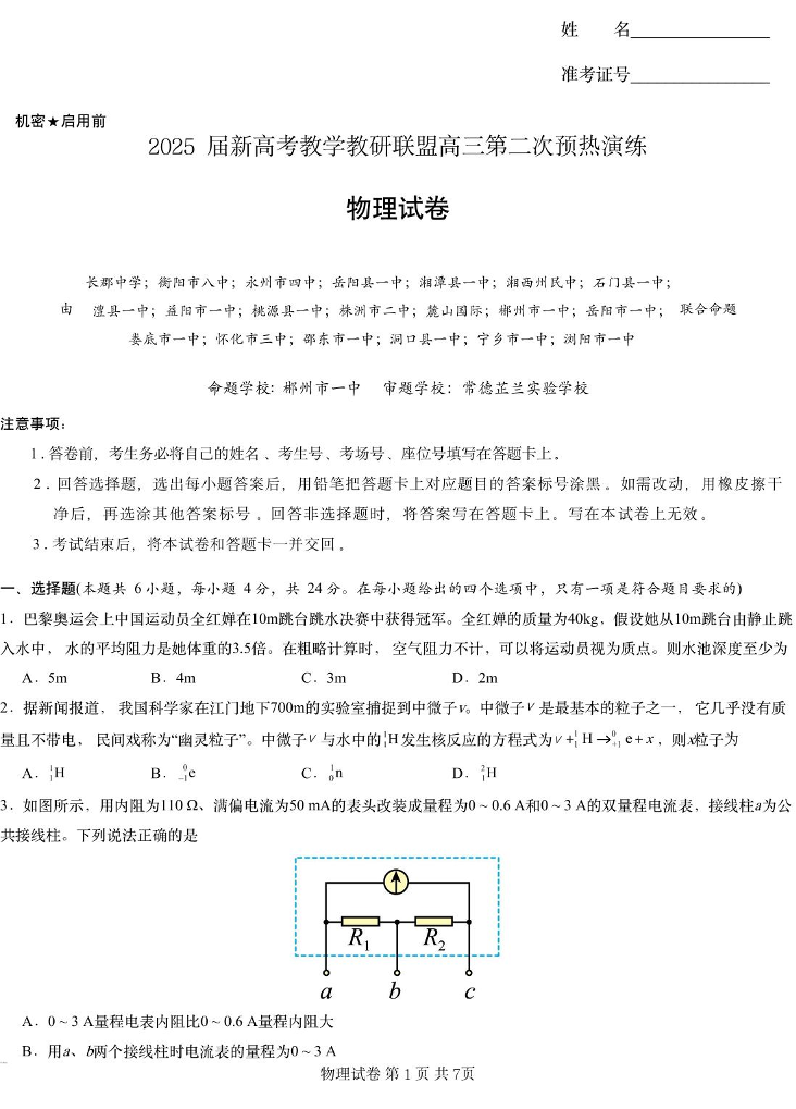 湖南省长沙市长2025年2月郡二十校联盟高三第二次预热演练物理+答案